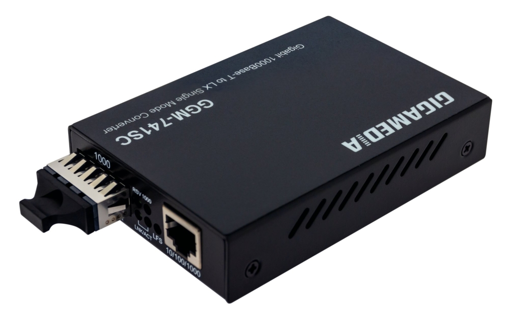 Media converters allow two types of cable to be connected. They are frequently used when extending a network over a long distance via the fibre optic (multimode or monomode), or to connect 2 separate networks more than 100 m apart. The GGM 741SC is a monomode converter from 1000 Mbps copper towards 1000 Mbps SC fibre optic cable.