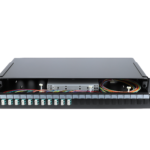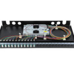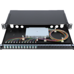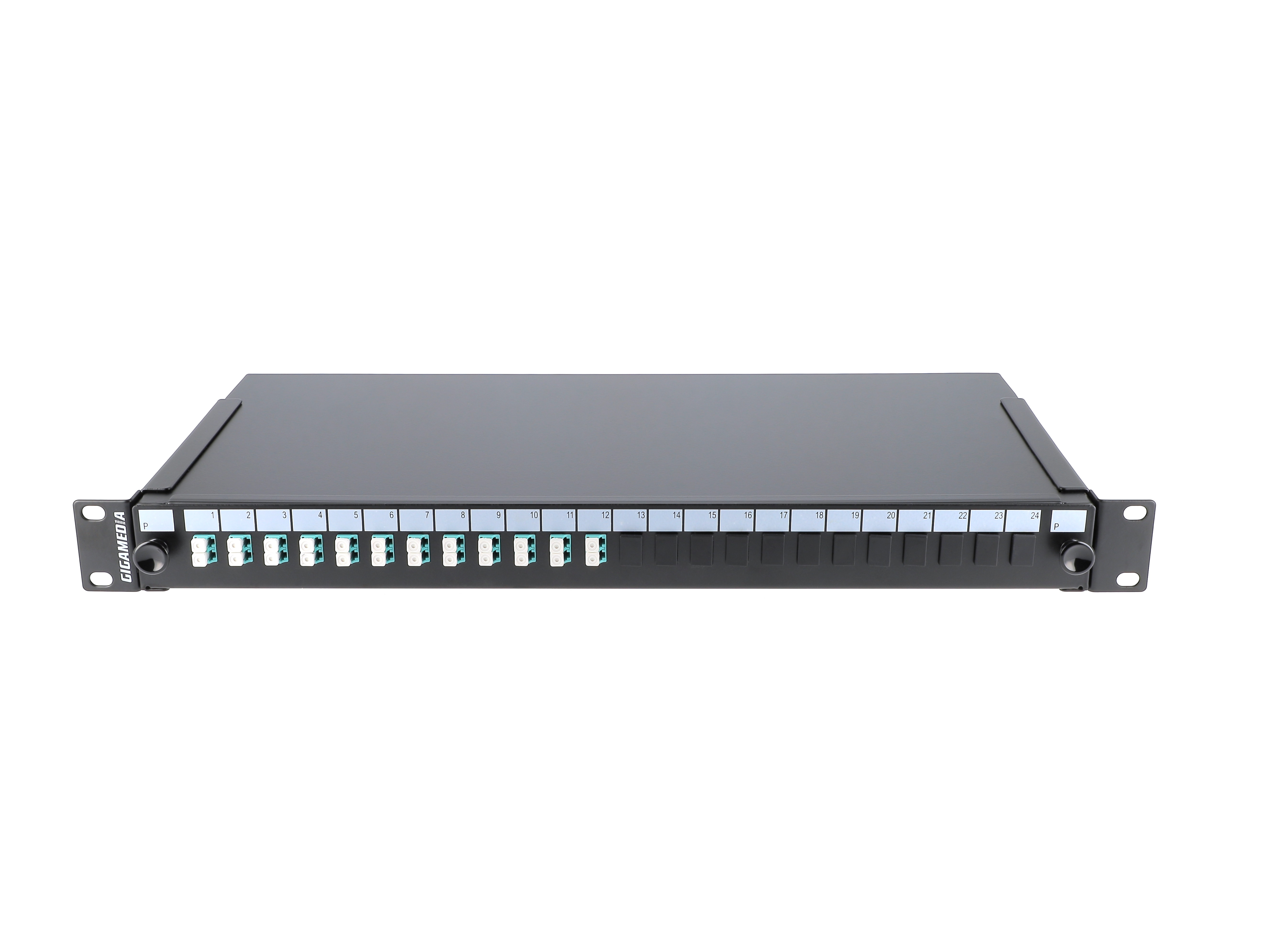 Sliding optical patch panel equipped with 12 LC duplex multimode adaptors + 24 LC OM3 pigtails.