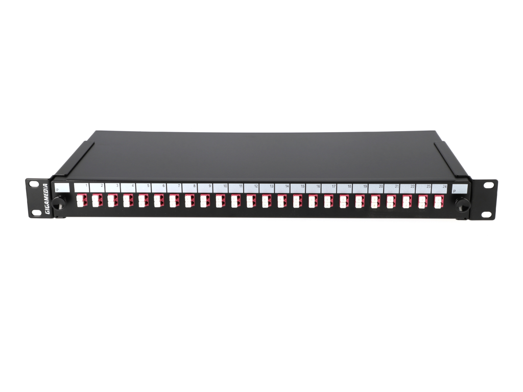 Sliding patch panel equipped with 24 LC duplex connectors + 48 LC OM4 pigtails