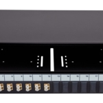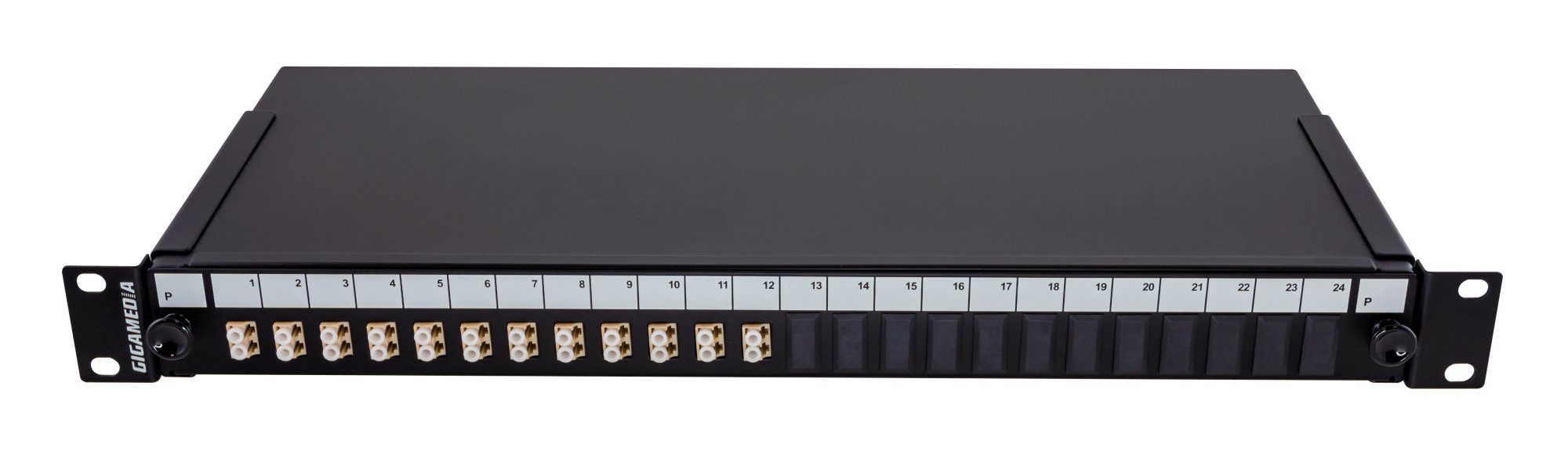 Sliding patch panel equipped with 12 LC duplex multimode connectors.