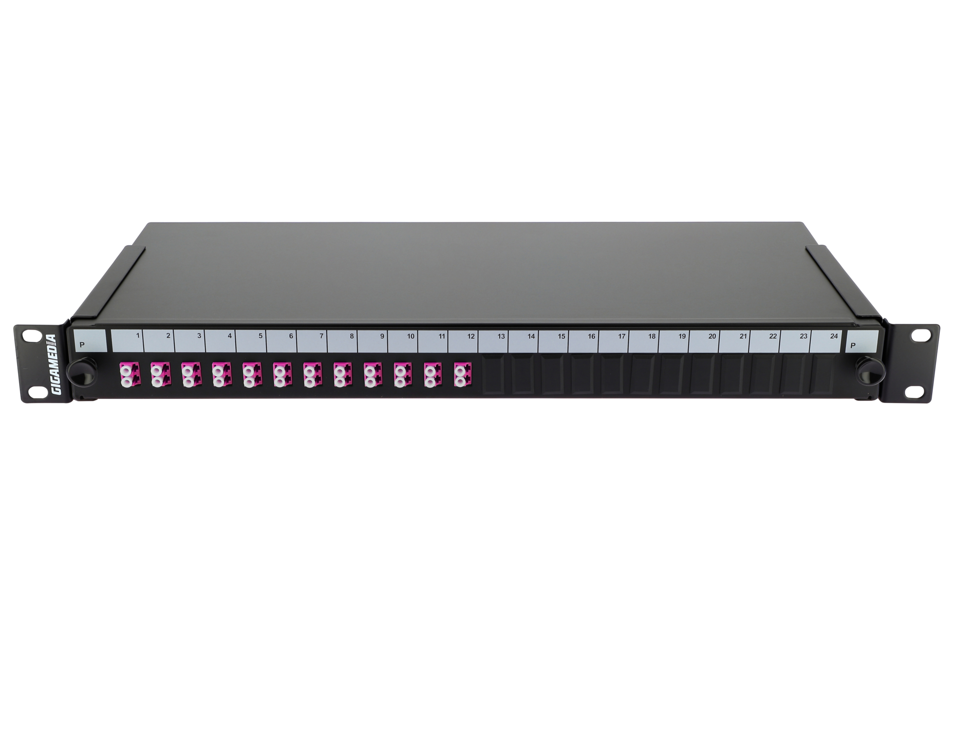 Sliding optical patch panel preloaded with 12 LC duplex OM4 adapters.
