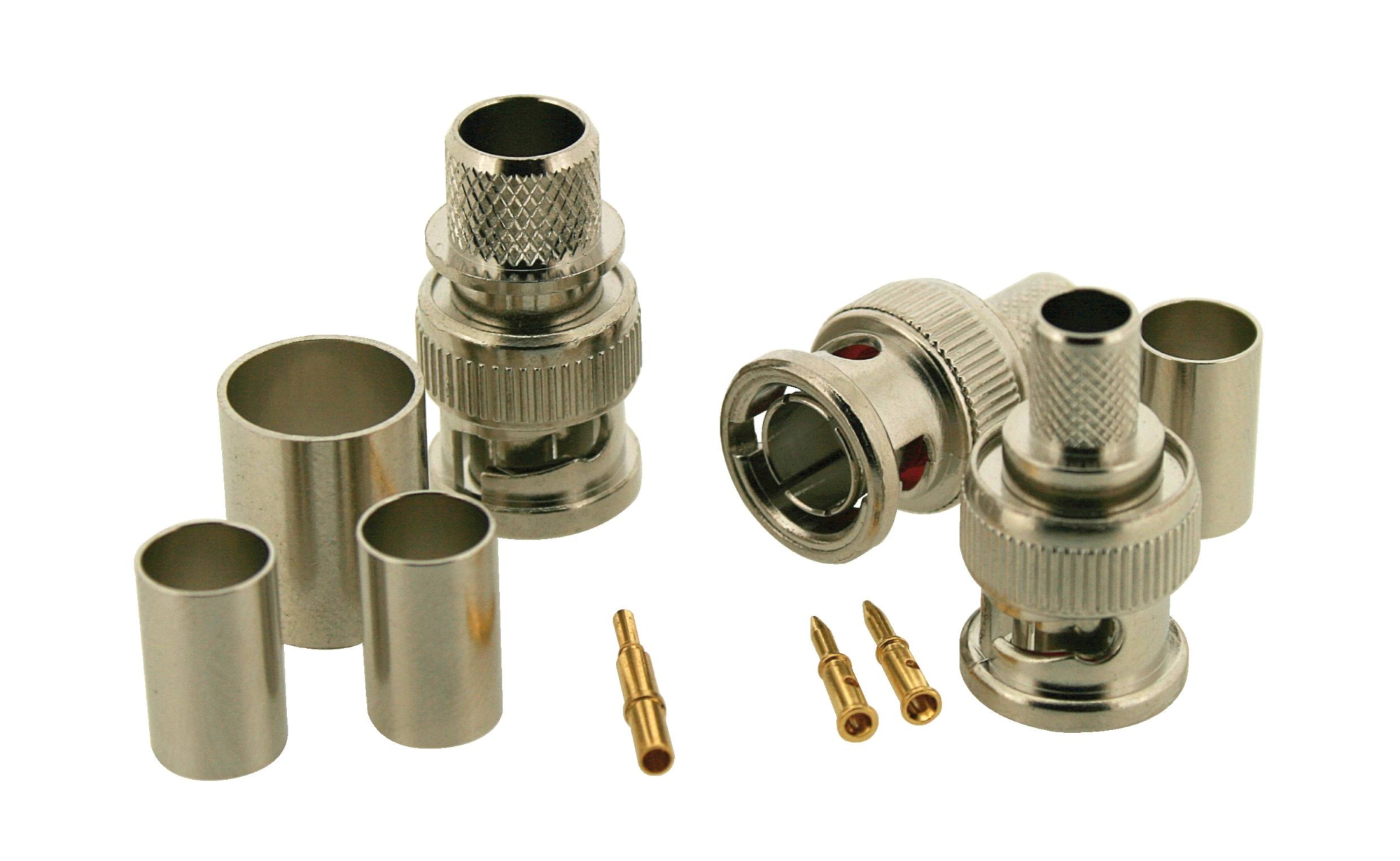 Set of connectors for crimping, screwing or compression for coaxial cables, packaged by lots. Sold in multiples of 10 or 50 pieces Pack of 50 pieces: Individual packaging of each connector For crimping: comprising 3 parts, connector body, central connecting pin and tightening ring To be screwed: 1 single piece, no tools required For compression: 1 single piece Bayonet connectors