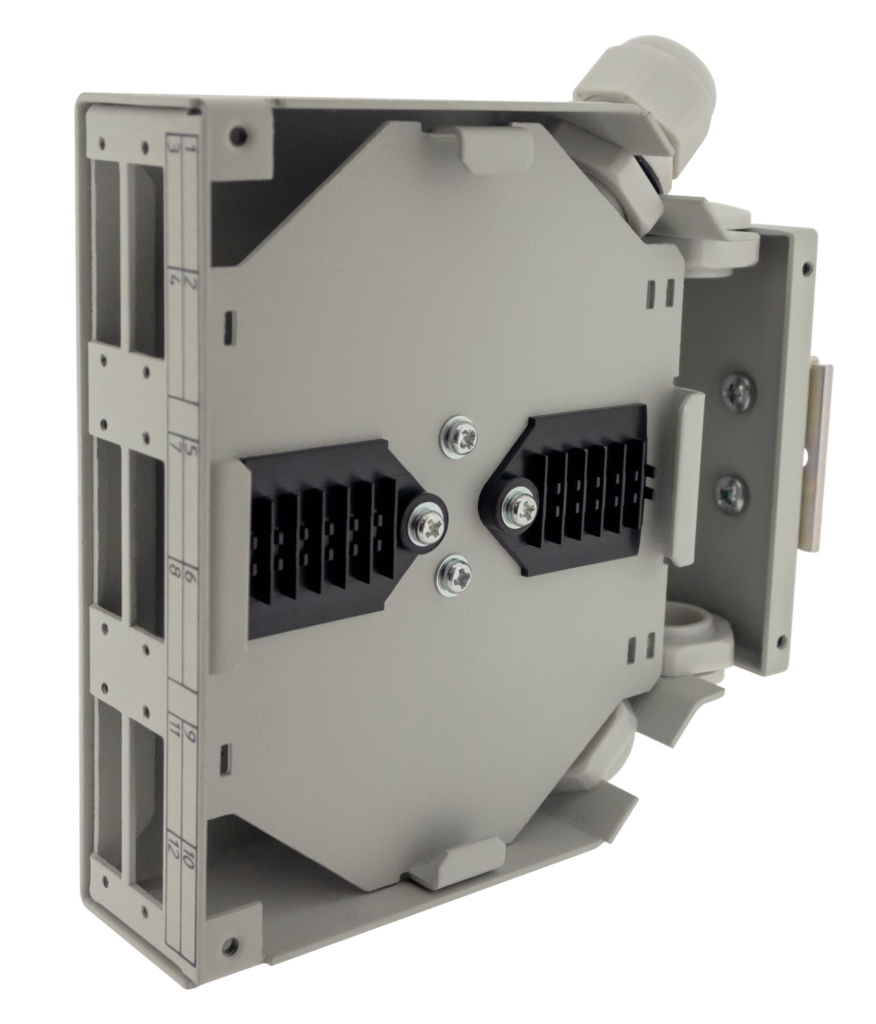 Doté d'un design compact et facile à installer, le boîtier GIGAMEDIA DINFO permet de connecter jusqu'à 12 fibres. Il permet également de mixer des ressources optiques et électriques à l'intérieur d'armoires industrielles.