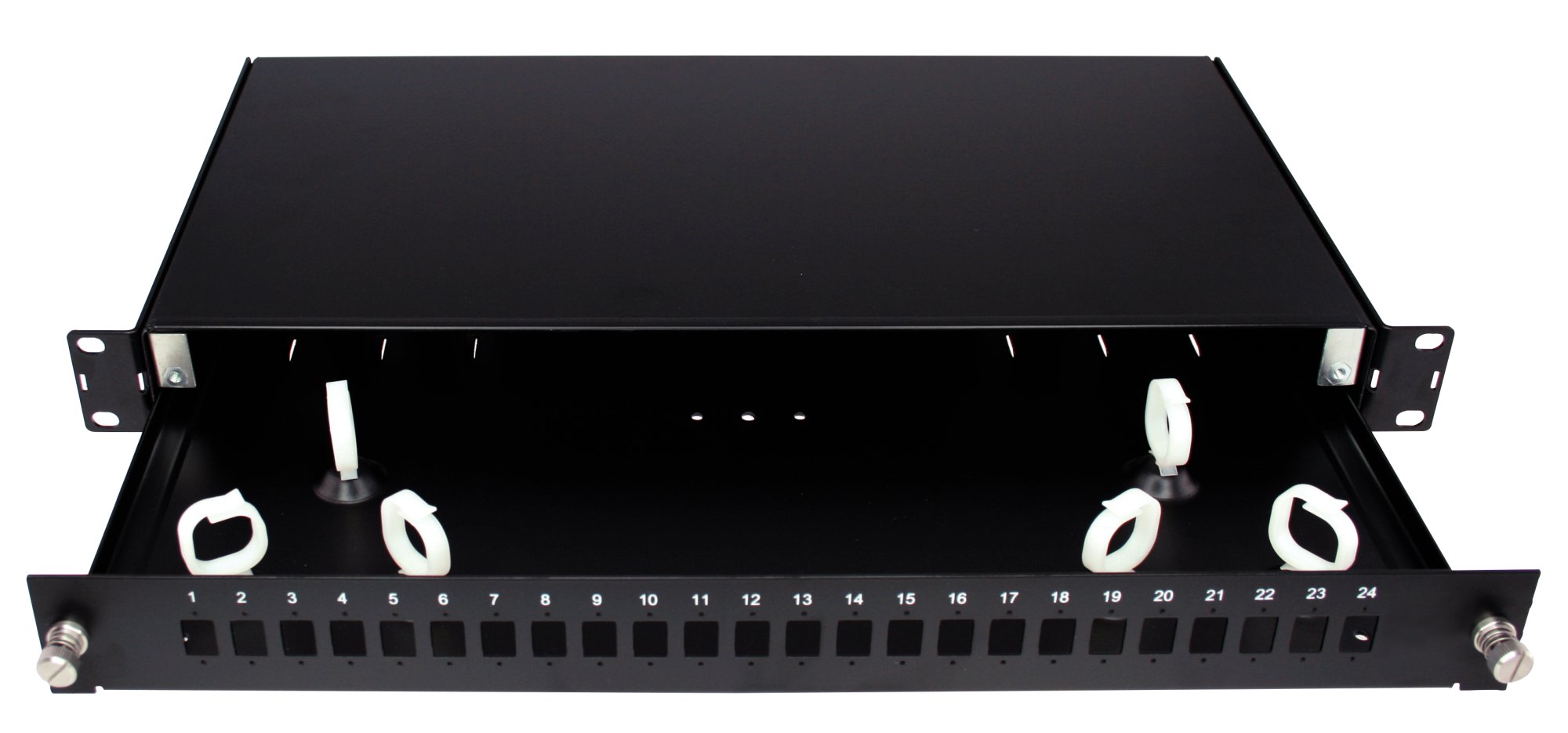 Tiroirs optiques coulissants non équipés permettant d'intégrer jusqu'à 24 raccords SC simplex ou LC duplex multimode ou monomode.