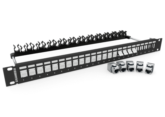 Apportant fiabilité et simplicité dans la mise en oeuvre, ce nouvel ensemble inclut un panneau de brassage 24 ports 1U premium (PANVC6A24BK) et 24 noyaux catégorie 6A Amd2 4PPoE blindés 360° de faible encombrement (NKJSC6ATL). Grâce à son système de support de câble arrière, le panneau de brassage keystone GIGAMEDIA vous permet d'optimiser vos temps d'installation, en facilitant le peignage des câbles et en favorisant la gestion des rayons de courbure. Livrés avec volets de protection anti-poussière blancs, les noyaux CAT6A blindés permettent également le repérage et l'identification des applications en face avant du panneau, grâce aux volets amovibles de…