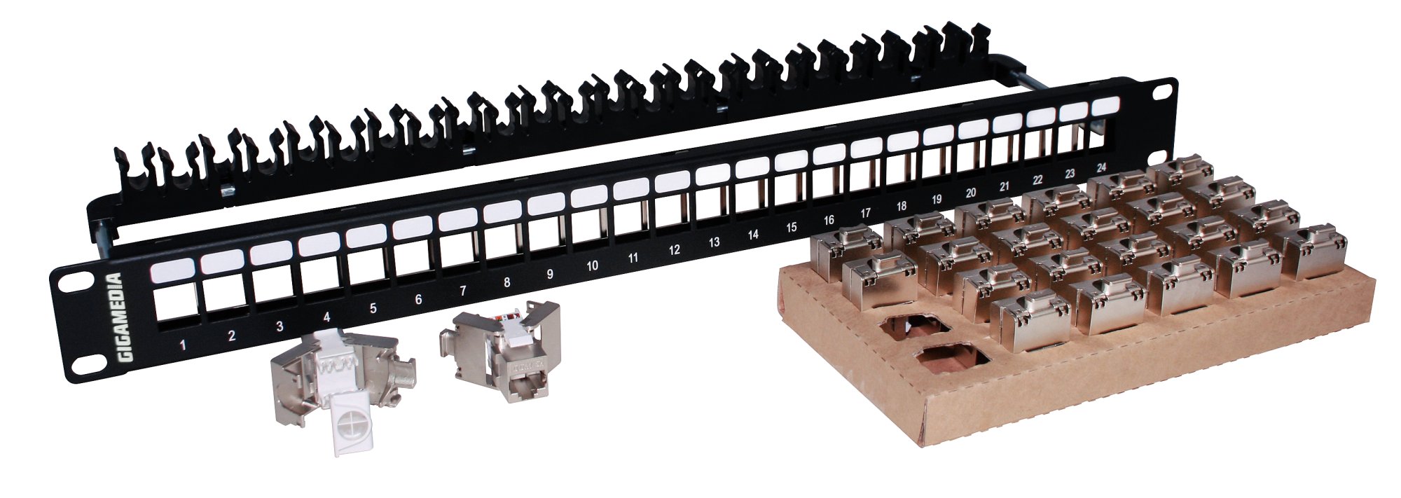 De conception totalement modulaire, les panneaux de la gamme GIGAMEDIA offrent une solution économique et un ratio coût par port très compétitif. Les noyaux qui équipent ces panneaux sont certifiés par un laboratoire indépendant. Ces noyaux sont également disponible individuellement. Tout en un ! Panneau métal 19″ noir avec clips de serrage arrière 24 noyaux CAT6A blindé sans outils